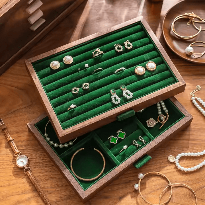 DE-LIANG Stackable Dark Green Velvet Black Walnut Wood Jewelry Ring Tray for Drawer Organizer