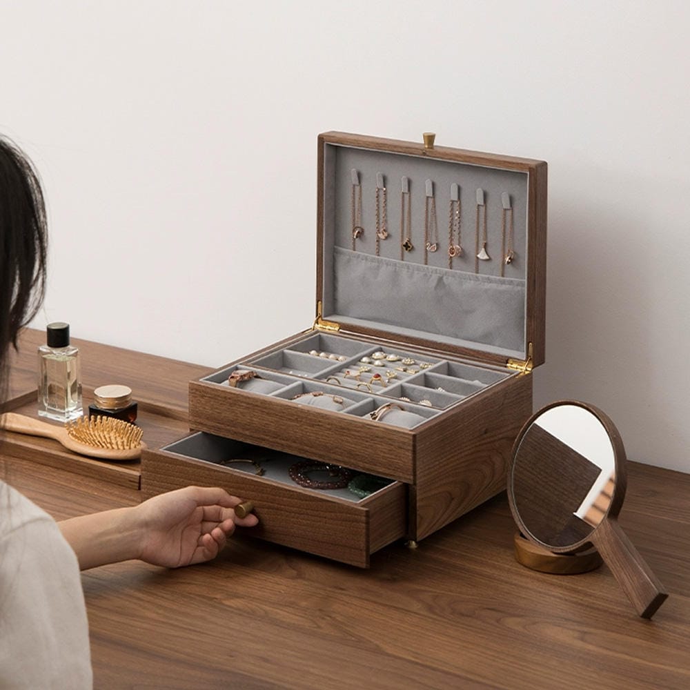 At DE-LAING, we meticulously select materials—PU leather, genuine wood, or high-grade metals. Our artisans combine modern machinery with hand-finishing techniques, ensuring each piece is crafted with precision and quality. The interiors are lined with soft velvet or fine fabrics to protect the jewelry while enhancing its visual appeal. Every hinge, clasp, and seam undergoes rigorous testing for durability and smooth operation.