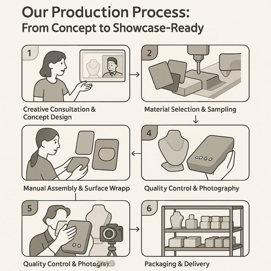 Creating high-end jewelry displays isn’t just about shape or color—it’s a precise blend of industrial craftsmanship, material expertise, and aesthetic sensibility. Here’s how we bring your display props to life, step by step: