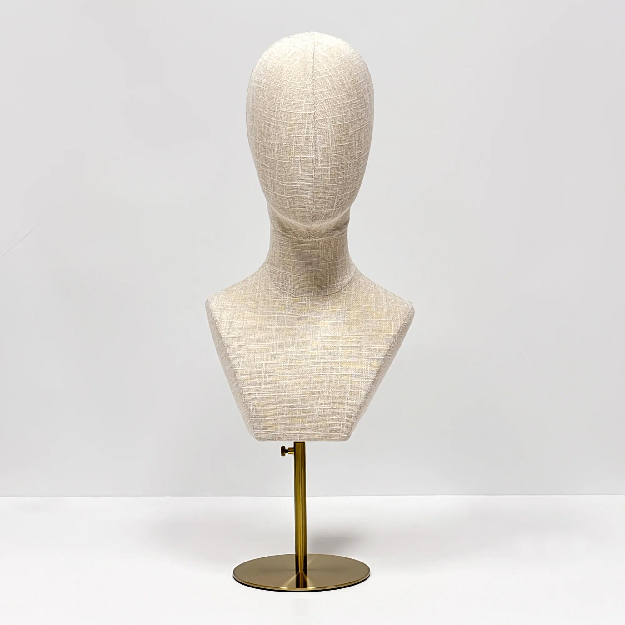 Wrapped in premium bamboo linen fabric, this mannequin head is fully pinnable, offering a tactile, natural texture that enhances the elegance of wigs, hats, scarves, glasses, and jewelry.